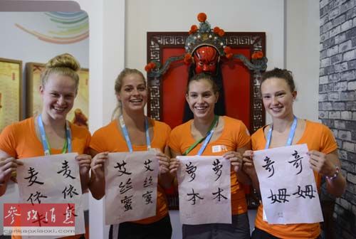 资料图:8月14日,来自荷兰的青年运动员在中国文化小屋里展示书法写成的中文译名。新华社记者普布扎西摄